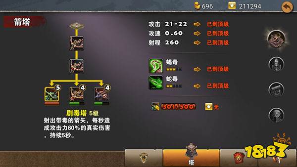 1. 箭塔:箭塔升級(jí)為毒塔后,傷害穩(wěn)定且具有減速效果,同時(shí)擁有不錯(cuò)的持續(xù)輸出能力。建議將毒塔放置在關(guān)卡的最前面,以實(shí)現(xiàn)傷害最大化,同時(shí)對(duì)于Boss也是一個(gè)不錯(cuò)的選擇。