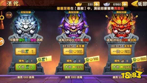 玩家可以在酒館進行武將招募,武將分為綠色、藍(lán)色、紫色、紅色和金色五個等級,其強度和稀有度隨著顏色的加深而遞增。