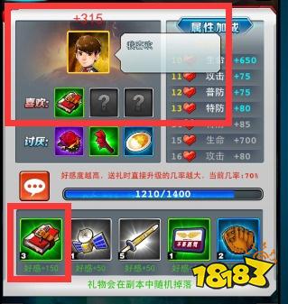 4、游戲中比較有特色的地方是玩家可以在【人間體】界面給人間體送禮物,當人間體得到自己喜歡的禮物后會提高好感度,好感度越高,增加的屬性也越多,這些禮物都可以在商店購買或者副本掉落獲得。相反,當人間體收到自己不喜歡的禮物時,可是會扣除好感度的哦。