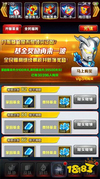 7、氪到V3后點擊購買基金,第一次大家可以花兩千光元購買基金能拿9000光元,這樣光元來的很快,如果想一次性獲得光元大家可以購買家園基金和奧特基金。(建議此法配著上一個更好)