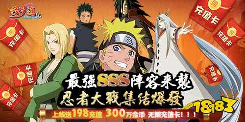 ★正版火影動漫授權;上線送198元真充值卡,使用既得99000鉆石、300萬金幣、直升VIP10;